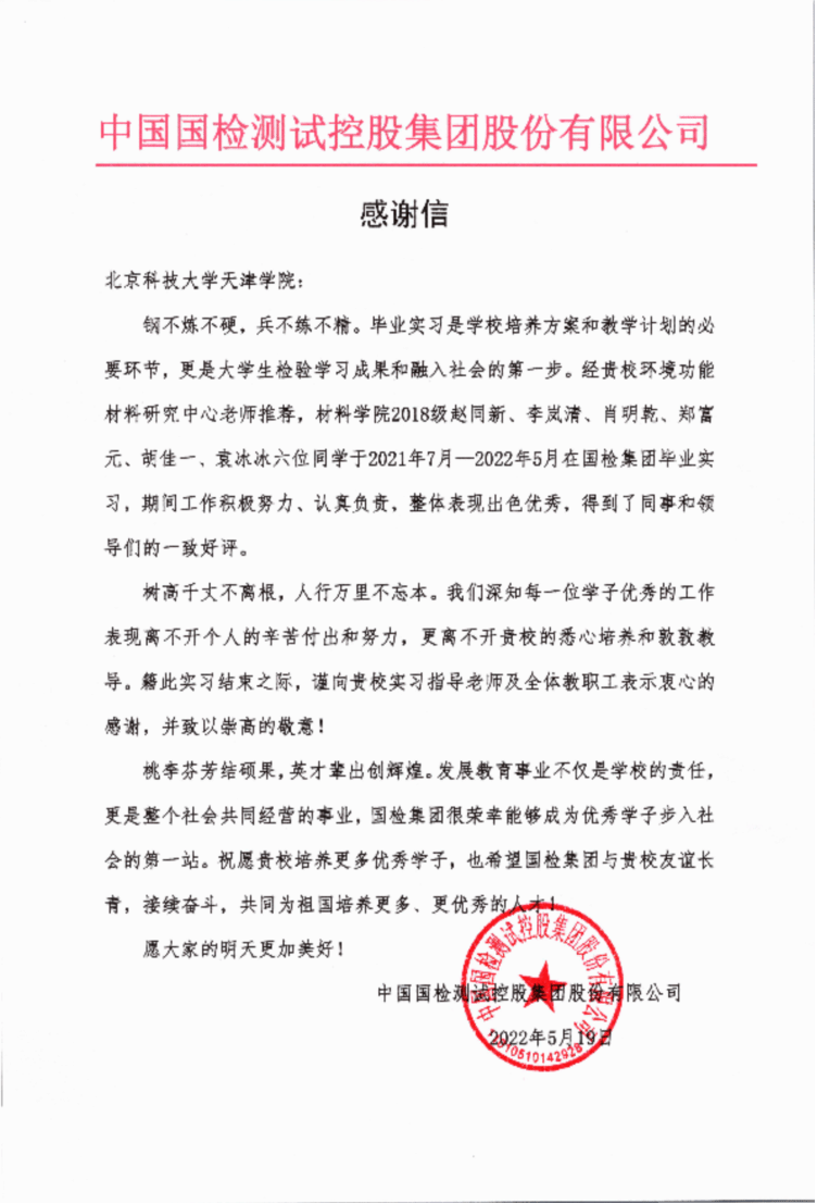 5月19日,伟德官网收到来自中国国检测试控股集团股份有限公司(国检集团)的感谢信,信中对伟德官网材料系六名在该集团参加毕业实习学生的优秀表现给予了高度评价,对学院的应用型人才培养模式给予了积极肯定,对学院老师们表达了感谢和认可。