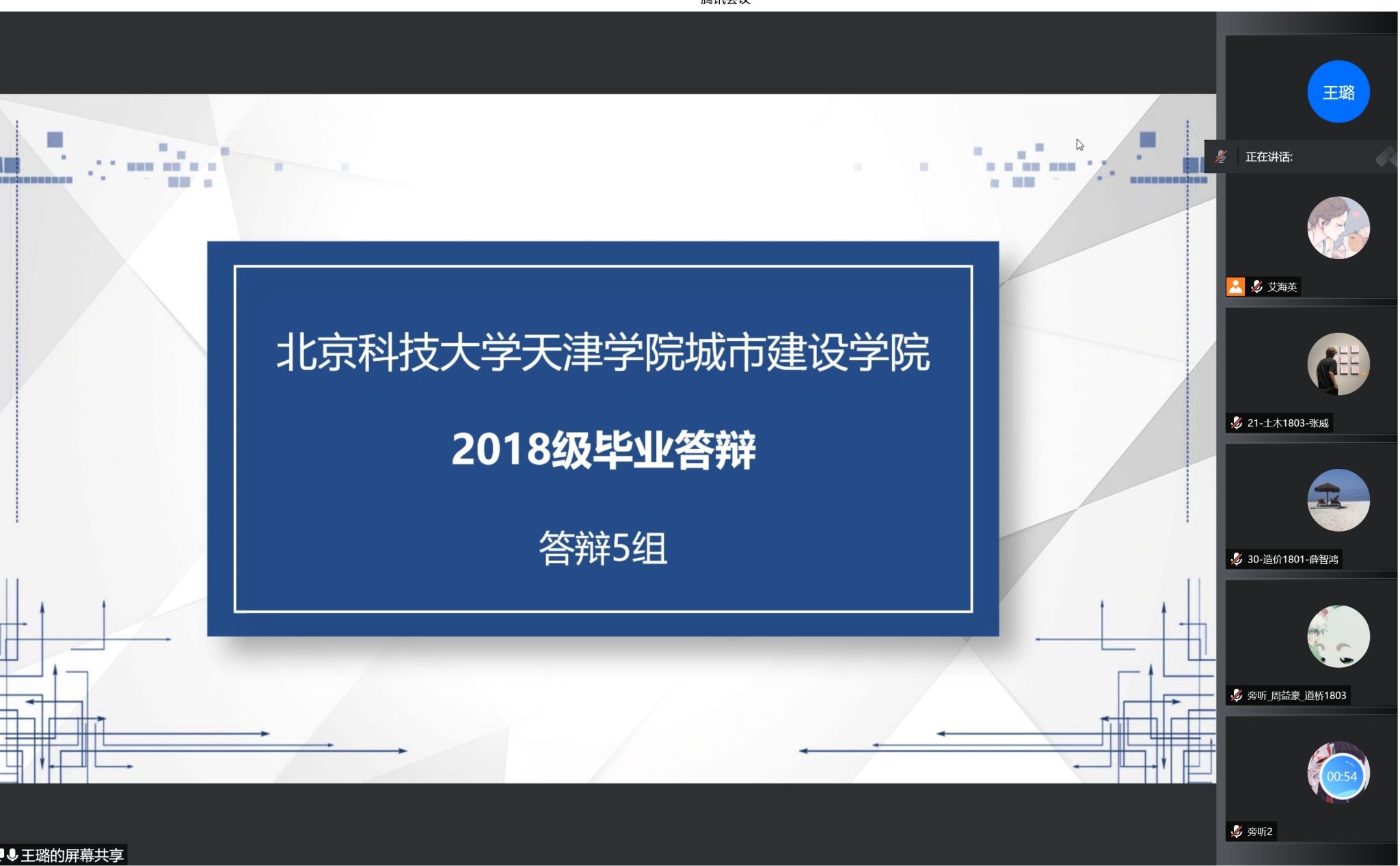 答辩过程中,毕业生采用共享屏幕的方式,对所做毕业设计的主要内容、个人所做的具体工作、毕业设计成果、遇到的困难及问题解决等进行了线上汇报。各答辩小组秘书对答辩全程录音录像,作为答辩过程记录材料,进行存档备份。