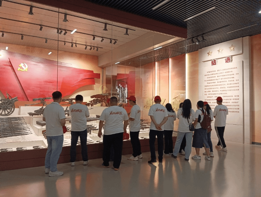 在平津战役纪念馆的“伟大胜利厅”,全体党员面向鲜红的党旗,庄严肃立,共同重温入党誓词,表达对党的忠诚和决心。