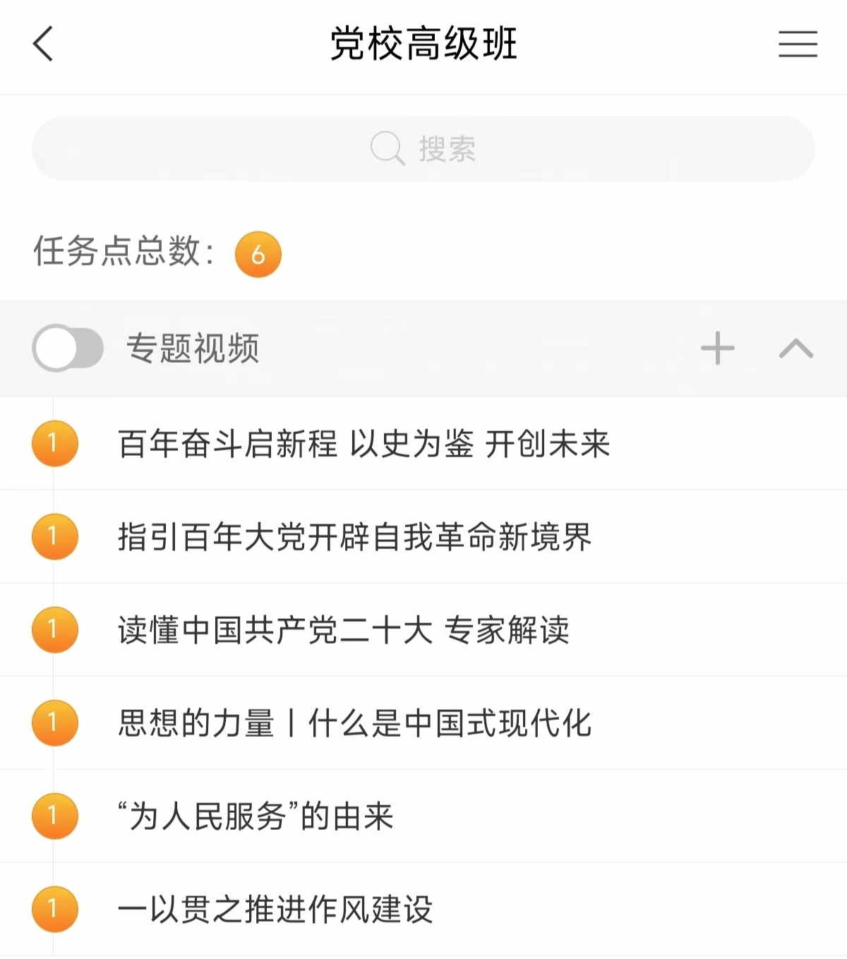 本环节以线上课程自学方式进行。参训学员通过学习通APP加入“第20期高级班”进行线上学习。共设置六个专题,在学习过程中,引导学员深刻领会习近平新时代中国特色社会主义思想的丰富内涵与核心要义,使学员明白这一思想是全面建成社会主义现代化强国的根本遵循,激励学员将这一思想化作行动的力量,全面推进中华民族伟大复兴是一场接力跑,学员们作为新时代的参与者,要接过先辈们传递的接力棒。