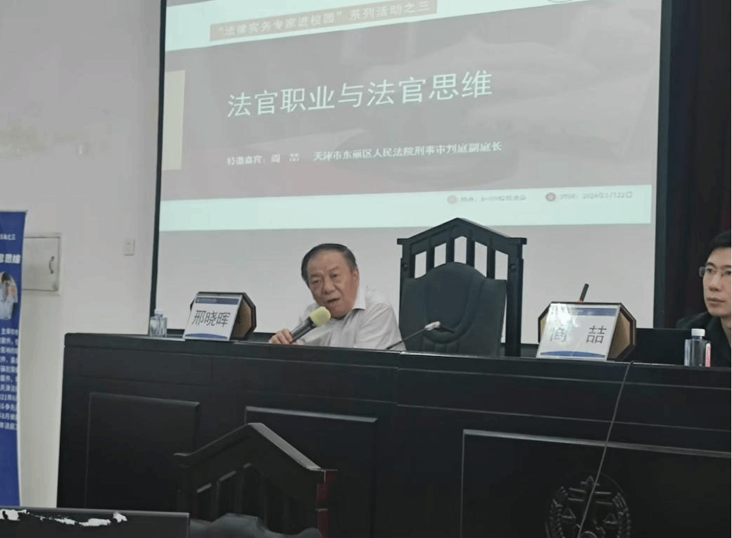 5月22日15时,法律系“法律实务专家进校园”第三期活动在八教模拟法庭如期举行。本次活动特邀天津市东丽区人民法院刑事审判庭副庭长阎喆法官为主讲嘉宾,以“法官职业与法官思维”为题,为法律系学生带来了一场别开生面的法律实务讲座。讲座由法律系常务副主任邢晓晖主持,刘国平老师、林铁军老师作为与谈人,一百五十余名法律系学生参加。