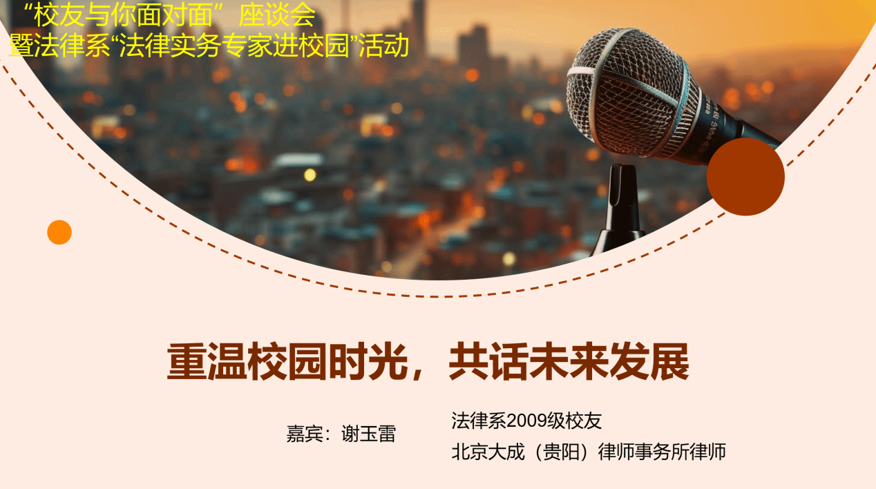 2024年4月18日下午,法律系2009级校友、北京大成(贵阳)律师事务所谢玉雷律师回访母校。校友会办公室和法律系在理工馆209室联合组织“校友与你面对面”座谈暨“法律实务专家进校园(第一期)”活动,邀请谢玉雷校友与在校生分享自己的求学和工作经验。校友会办公室柯瑜主任、白瀑老师、马璐瑶老师以及法律系邢晓晖常务副主任、刘国平老师、罗大钦老师共同出席本次活动。