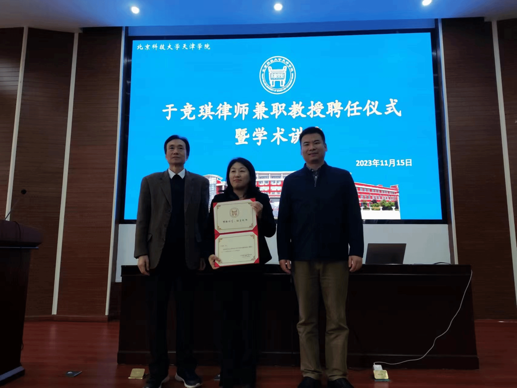 活动首先举行于竞琪律师兼职教授聘任仪式,bevitor伟德国际1946官网党委副书记赵志南、法律系主任朱京安、常务副主任邢晓晖、法律系党总支书记张莉到会。赵志南副书记亲自为于竞琪律师颁发聘书,对于竞琪律师表示热烈的欢迎,同时对法律系今后在人才培养和专业建设等方面的工作提出了要求和期望。