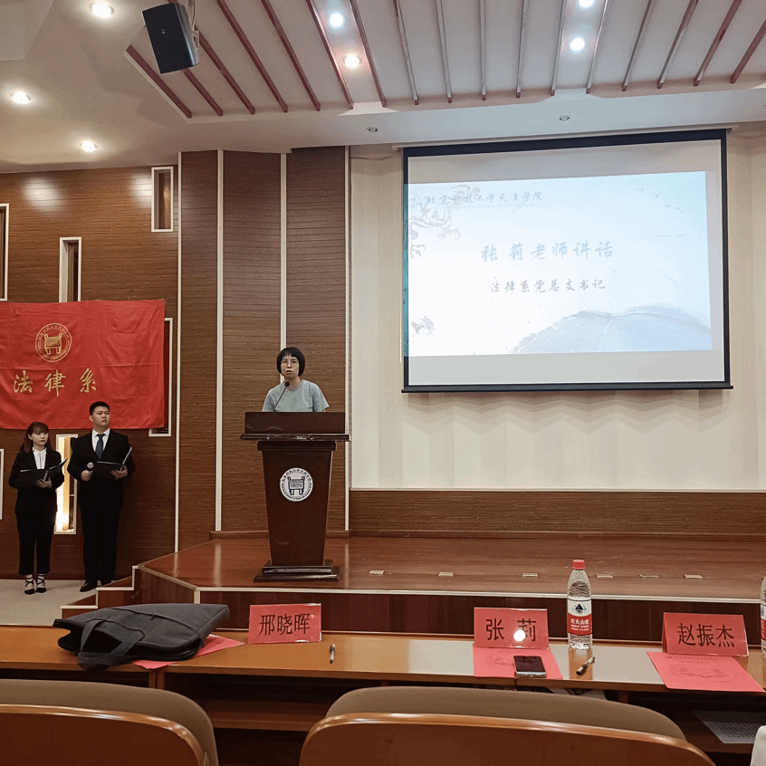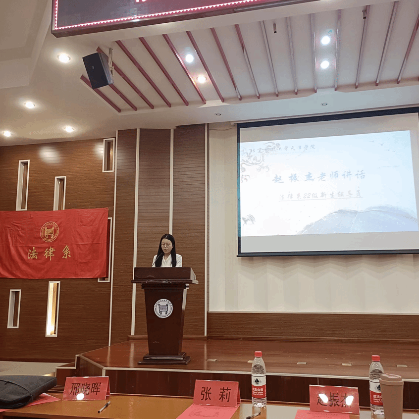 法律系党总支书记张莉老师以提问的方式表明确定目标的重要性,并表示教学是双向的过程,通过自己多年的教学经验对法律系2022级新生提出勤学、笃思、力行、明志四点期望。