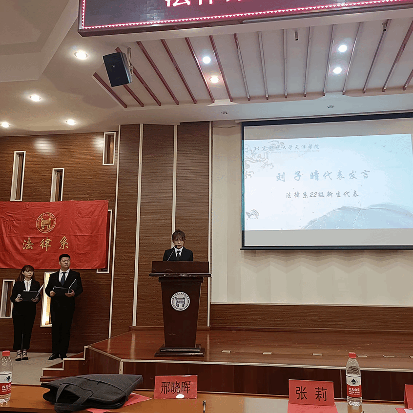 法律系常务副主任邢晓晖老师首先以“老学生”的角度阐述自己对“上大学”的看法,并要求同学们做到“三清”,强调了法学专业学习的重要性。最后邢主任劝诫同学们要树立远大志向,求得真才实学。