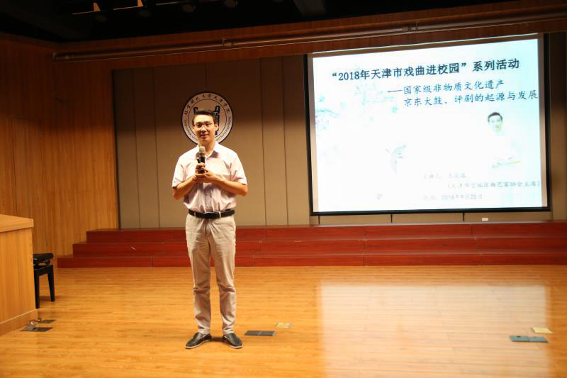 为贯彻党的十九大精神,认真落实《中共中央宣传部等印发关于戏曲进校园实施意见的通知》和《天津市关于开展戏曲进校园的实施意见》要求,进一步弘扬中华优秀传统文化,增强文化自信,促进戏曲传承发展,9月25日晚7:00,2018年天津市戏曲进校园——国家级非物质文化遗产评剧和京东大鼓的起源与发展主题讲座在12教弘艺音乐厅成功举办。本次讲座邀请到了宝坻区曲艺家协会主席王文磊到伟德官网开讲,艺术系副主任林碧芸及二百余名爱好评剧和京东大鼓的师生共同聆听了讲座。
