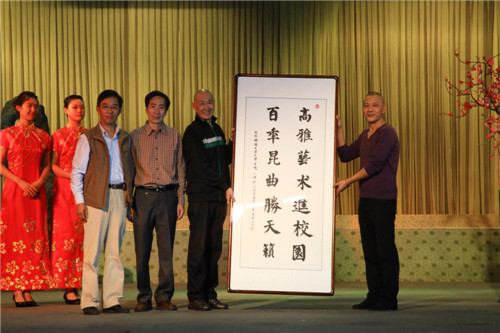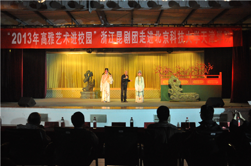 10月9日晚7:00,由伟德官网团委主办,艺术教育中心承办的“2013年高雅艺术进校园”——浙江昆剧团走进bevitor伟德国际1946官网昆剧专场在学生活动中心二楼举行,演出由浙江昆剧团的艺术家们带来昆剧经典曲目《西园记》。浙江昆剧团副团长程伟兵、党委书记王世英,伟德官网院长郭景文、党委副书记白亮出席并观看演出。