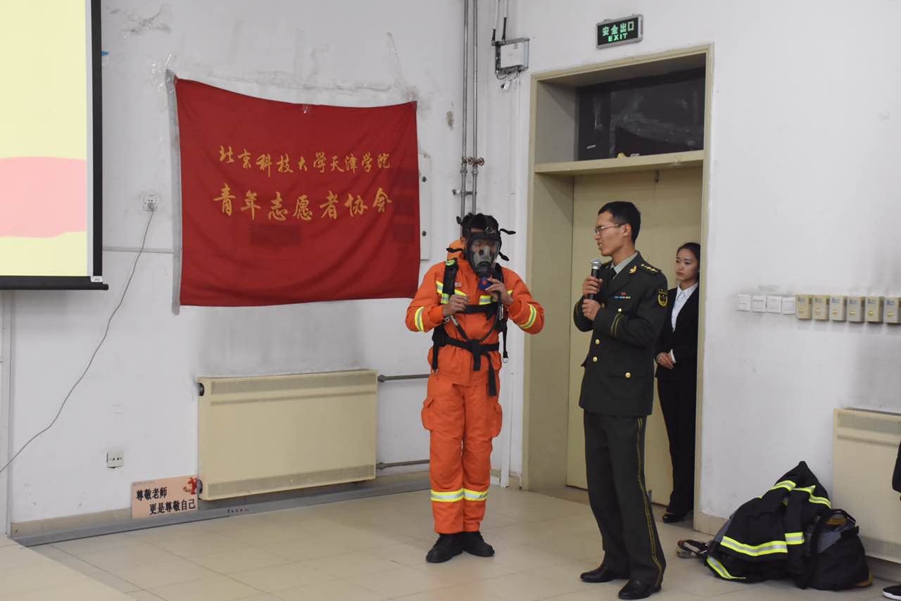 晚上六点半,9教108教室,消防安全知识讲座在大家热烈的掌声中正式开始。在播放开场视频之后,顾队长开始了正式的演讲。顾队长的讲解深入浅出,内容涉及火灾发生的原因、怎样预防火灾、火场逃生基本知识、灭火器的正确使用以及如何正确报警等方面进行了生动讲解。顾队长不仅从理论上向大家传授关于消防的各种安全防范知识,而且列举了大量实际生活中的真实案例,教训深刻,发人深省。战斗班班长肖佳现场演示并教授学生消防服及配件的穿戴方法,并邀请了几名同学亲身试穿了消防官兵的战斗服。穿着厚重的战斗服,同学们体会到了消防官兵的不易,并且向消防官兵表达了敬意。最后以一段京津新城消防官兵冰上救人的英勇视频结束了此次消防知识讲座。