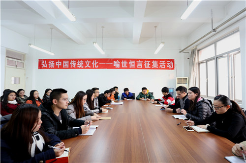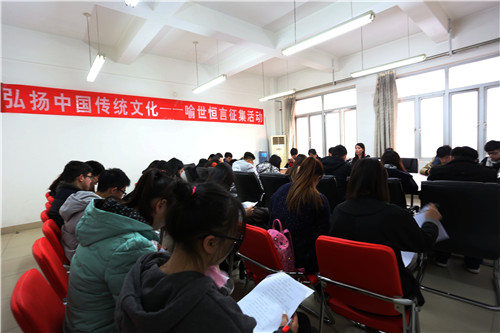 团委副书记潘柏夷首先向在场所有人员介绍了关于喻世恒言征集活动的内容和形式,告诉大家征集恒言的主题方向。而后团委书记孟祥瑜介绍了此次活动是在国家大力弘扬中国传统文化的环境下举办,旨在提高大学生对传统文化的认知和了解,集思广益,最终甄选出百条恒言,在校园、教室进行张贴,丰富校园文化,营造学习氛围。在场同学纷纷踊跃发言和交流,大家就征集活动所给出的主题展开了讨论,发表自己的见解。