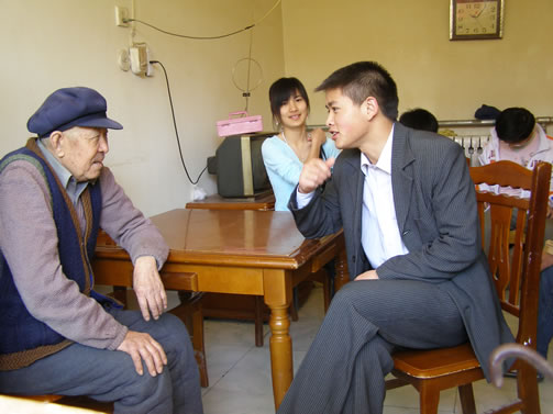 机械工程系分团委书记罗富臣与敬老院老人交谈
