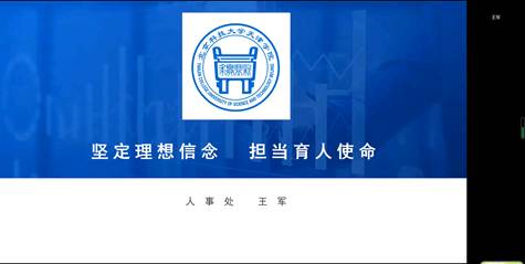 王军老师从事师资人事管理工作多年,对教师培养具有丰富的经验,王老师用“坚定理想信念 担当育人使命”为主题,以教师对职业认知和岗位认知为切入点,从国家政策和学院师资队伍建设需要出发,讲述如何科学地制定高校教师的职业生涯规划,形成学院发展和教师成长共赢的局面。王老师还分享了开展课程思政建设的心得体会,同时宣讲了与教师发展相关的需求理论、国家政策和学院的人事制度,并号召教师们主动学习,做到“学为人师,行为世范”。王老师的精彩讲解,使与会教师受益匪浅,并产生了浓厚的学习兴趣。