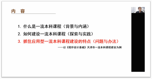 本期讲座采取线上直播形式,由bevitor伟德国际1946官网信息工程学院教学副院长于静老师主讲。于静老师作为bevitor伟德国际1946官网第一批入职教师,亲身经历了学院课程建设的各个发展阶段。根据《教育部关于一流本科课程建设的实施意见》(2019年10月)提出的“依据高校办学定位和人才培养目标定位,建设适应创新型、复合型、应用型人才培养需要的一流本科课程,实现不同类型高校一流本科课程建设全覆盖”的精神,bevitor伟德国际1946官网积极布局和落实,于静老师紧紧围绕伟德官网人才培养目标的定位,构建教学团队,凝练已有成果,承担并完成了天津市级一流课程建设项目。讲座中于静老师结合工程教育认证核心理念,以“面向应用型人才培养的一流本科课程建设思考”为主题,深入实际重点解读了基于应用型本科课程特点的一流课程建设指标体系和建设路径,以天津市一流本科课程《程序设计基础》建设为例,分享了贯穿课程建设全过程的先进的教育教学理念、突出创新性的解决方案以及增加挑战度的实践经验与感悟。