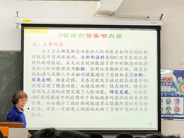 在研讨与交流环节,舞蹈系教师焦海堃与艺术设计系教师陈思鸣分别上台,展示自己指导的学生毕设(论文)范例,梁教授现场给予点评,对论文目录格式、文献综述、文章结构、结论、参考文献规范化等方面给予了指导性意见。