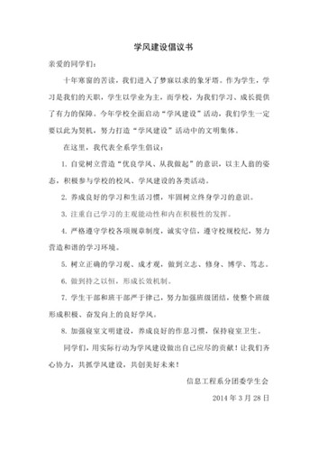 2014年4月10日,信息工程系分团委、学生会在三食堂正门外打出“以学为基,以学立行——优良学风,从我做起”的横幅,并向全院同学发出学风建设倡议书。同学们都满怀热情的积极参与到活动中,并主动在横幅上签上自己的名字,纷纷表示,要从我做起,严格要求。