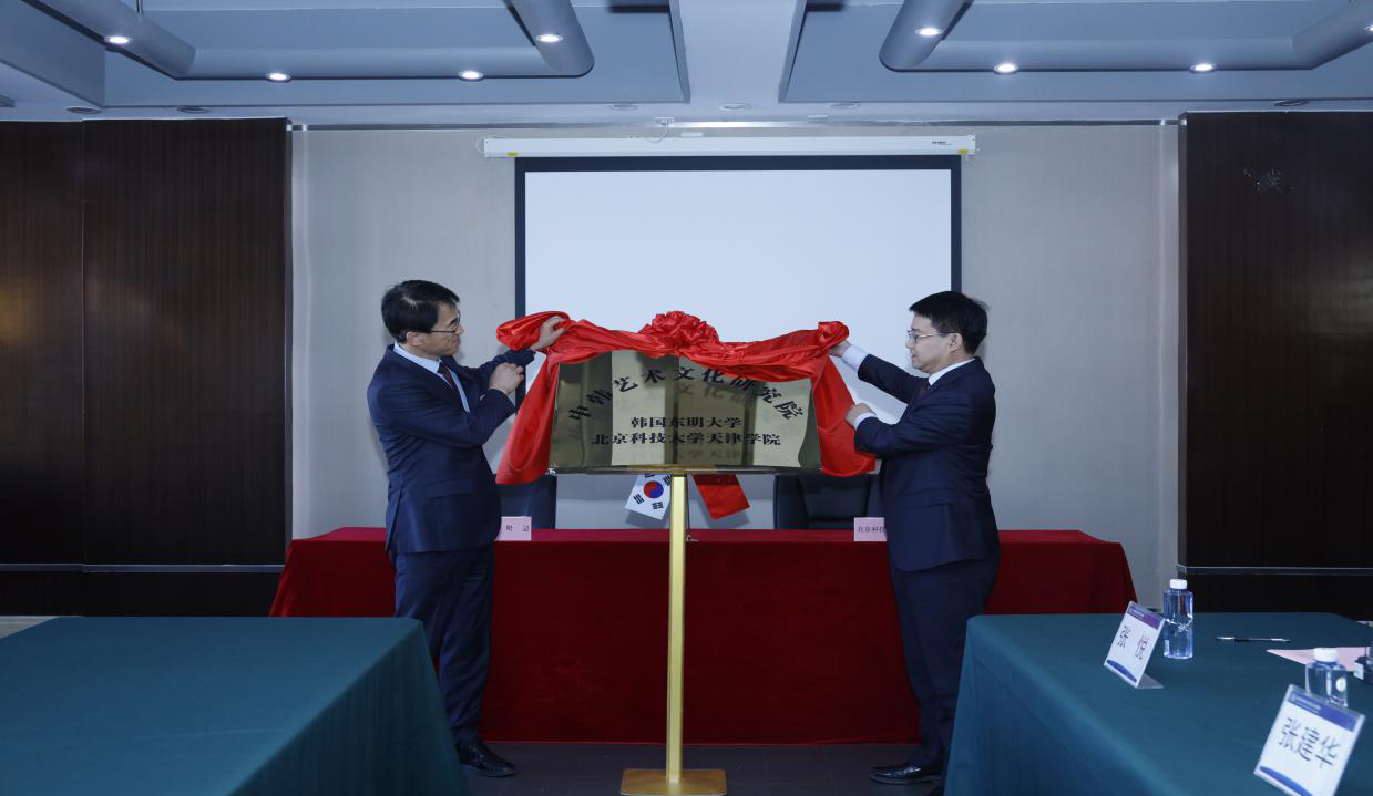 签约仪式后举行中韩艺术文化研究院揭牌仪式,由王斌院长与权重洛副校长共同揭牌。揭牌仪式后,王斌院长颁发聘书,聘请权重洛副校长为中韩文化发展研究院名誉院长,王东教授为名誉副院长。双方交换校方纪念品,并拍照留念。