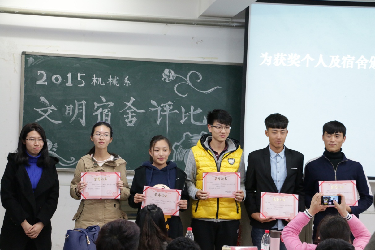 此外,本次活动还评选出2015机械系文明宿舍优秀奖3名、三等奖3名、二等奖2名、一等奖1名。