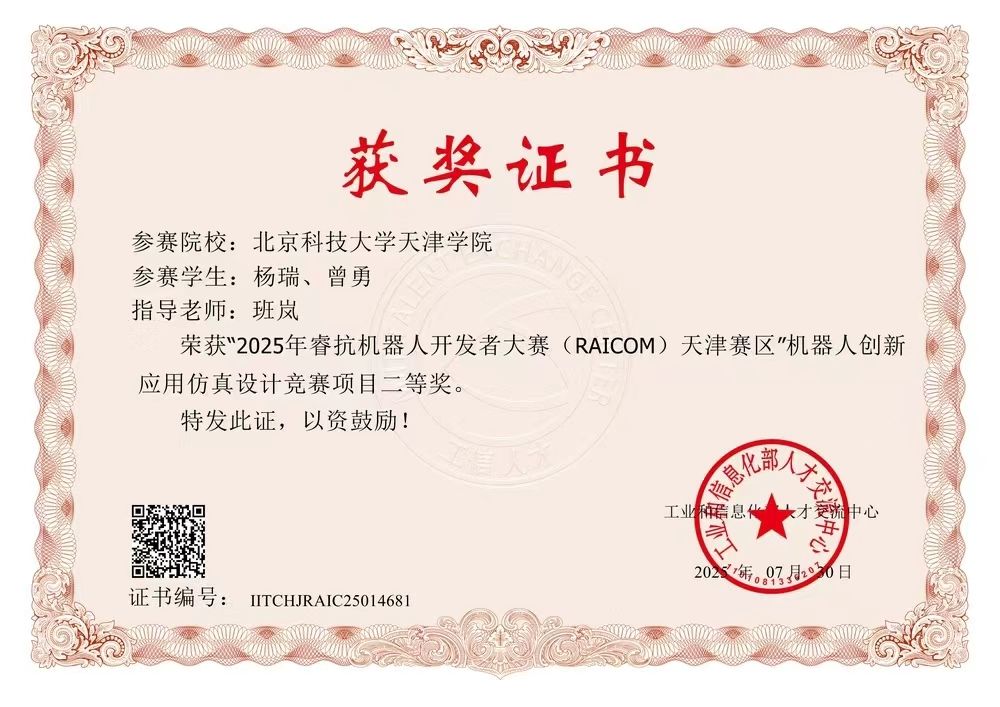 近日,由工业和信息化部人才交流中心主办的2025睿抗机器人开发者大赛 (RAICOM) 全国总决赛落下帷幕,伟德官网智能制造学院机械工程(机器人应用) 专业学生杨瑞和曾勇在班岚老师的指导下,于“机器人创新应用仿真设计”赛项中荣获全国总决赛二等奖和天津市赛区二等奖。