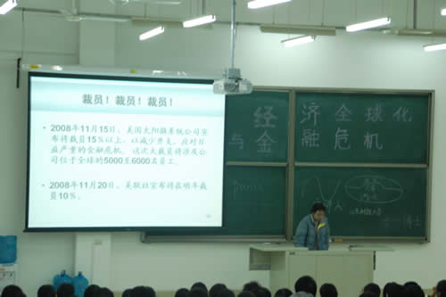 于博士在讲座中强调经济危机带来挑战的同时也带来了机遇,作为当代大学生应当抓住机遇,努力学习,为自己的成长创造条件,体现自身的价值。最后讲座在同学们的掌声中圆满结束。