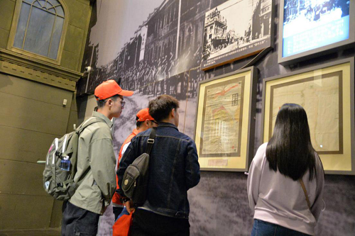 “复兴之路”基本陈列里的1200多件(套)珍贵文物、870多张历史照片以及逼真的战斗场面吸引了在场的同学们,他们时而驻足观看拍照留念,时而低头思考记录感想,被带回了近代以来跌宕起伏、波澜壮阔的难忘岁月。