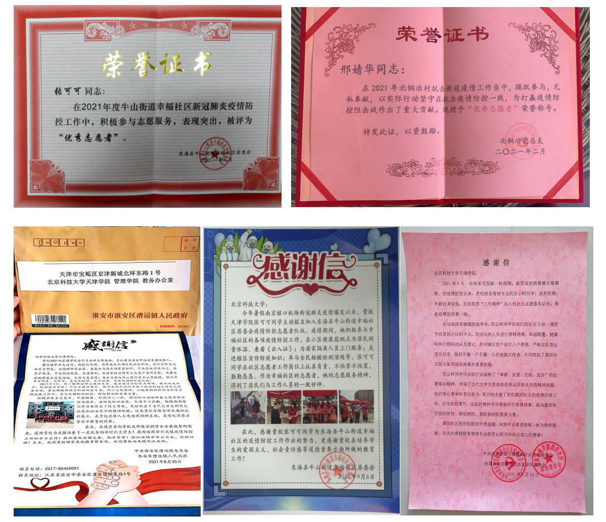 邵俊茹、张可可、苏云柯、张起明、范伊静、李滢欣、邢婧华、王双慧、黄晨琳,一个个名字跃然出现在各种感谢信和志愿者证书上,这些“功勋章”不仅深切体现了他们的优良品质和担当作为的精神风貌,更蕴含着他们背后的默默付出和诠释青年学子责任与使命的实际行动。交通卡口执勤、核酸检测登记、防疫知识宣传、消杀重点场所、入户排查实名登记、为居家隔离人员上门服务,他们在炎炎夏日,不畏酷暑,迎难而上,积极投入抗疫一线工作,主动承担起防疫工作中“守门员”、“宣传员”、“战斗员”、“保障员”的角色,尽自己所能共同筑起阻击新冠疫情的重要防线。