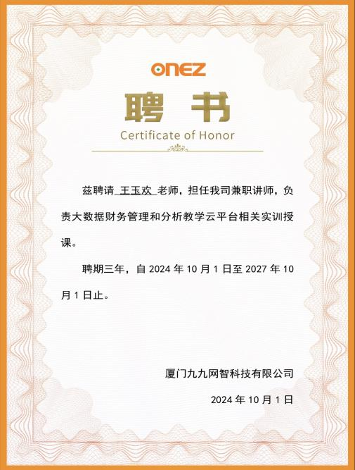 在培训过程中,管理学院十分注重对青年教师的培养,着力为青年教师深度拓展各种培训平台,不断给予系统培训机会,帮助青年教师专业成长,教师们在培训期间也收获颇丰。今年暑假管理学院任洁老师和王玉欢老师依托财务报表一流课程建设,参加了厦门九九网智科技有限公司组织的大数据财务管理和分析教学云平台相关实训,并通过考核,获得培训证书。随着数字化技术和智能化技术的快速发展,相关技术已经广泛运用于会计信息处理、财务报告编制、审计和税务等方面,此次培训结合大数据分析技术,对大规模财务数据进行数据清洗、转换和详细分析,最终实现数据可视化功能,能够满足伟德官网专业课程和教师技能发展需求,良好提升教师数字化技能。由于伟德官网王玉欢老师在此培训中表现突出,并在最终考核时取得优异成绩,九九网智科技有限公司特地向该教师发出邀请,担任兼职讲师,最终王玉欢老师获得兼职讲师聘书。