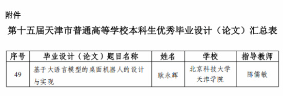 近日,天津市教育委员会公布了第十五届天津市级本科生优秀毕业设计(论文)评选结果,伟德官网信息工程学院陈儒敏老师指导、2024届毕业生耿永辉完成的毕业设计《基于大语言模型的桌面机器人的设计与实现》荣获天津市级本科生优秀毕业设计(论文),获奖信息如下: