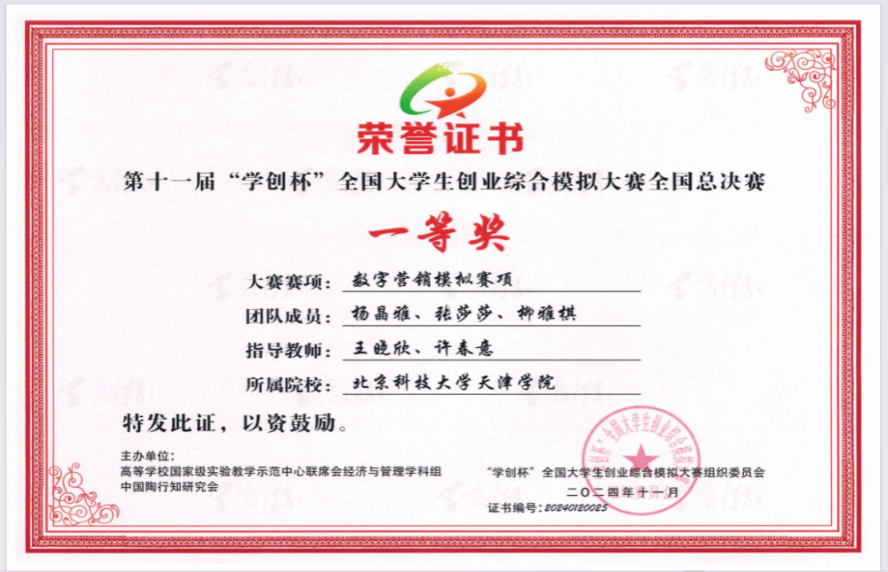 2024年11月1日至3日由高等学校国家级实验教学示范中心联席会经济与管理学科组、中国陶行知研究会主办的第十一届”学创杯“全国大学生创业综合模拟演训活动总决赛在徐州医科大学顺利举行,伟德官网荣获全国一等奖一项,全国二等奖两项,省市级一等奖1项。