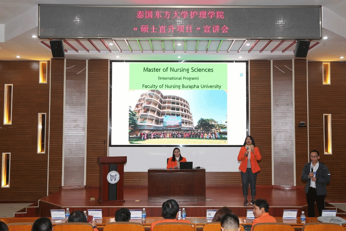 交流会后,泰国东方大学(BUU)面向大健康学院护理专业学生开展硕士项目宣讲,东方大学硕士项目负责人Dr. Chintana Wacharain在会上分享了泰国东方大学(BUU)的概况以及硕士项目的课程设置、申请流程和优势,详细介绍了BUU的留学生政策、留学费用、实习实践、毕业工签等同学们比较关注的问题。同时,对于泰国东方大学短期研学项目进行了讲解,热情邀请同学们赴泰体验学习。会后耐心幽默地解答了同学们的疑问,此次宣讲产生热烈反响。