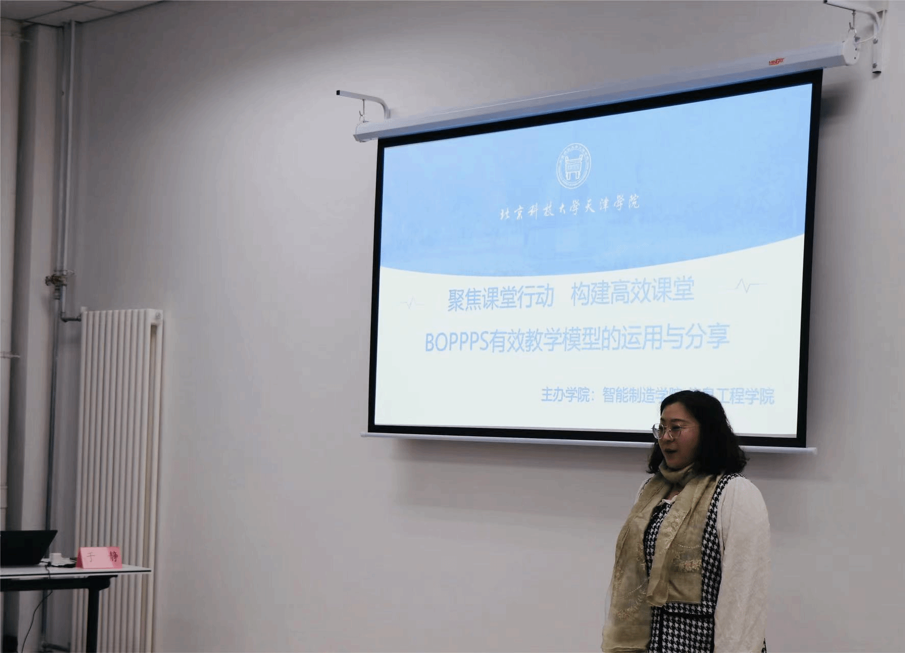 班岚老师做了开场介绍,从学院内涵式高质量发展的指导思想角度切入,引出本次研讨会的主题“聚焦课堂行动,构建高效课堂—BOPPPS有效教学模型的运用与分享”;于静老师就“教无定法”、“孤芳自赏”的现象,指出了老师们在教学过程中存在的一些问题;智能制造学院孙沛叶老师和信息工程学院王琳老师分别以十分钟微课形式演示了BOPPPS教学模型,两位青年教师授课内容丰富生动、深入浅出、引人入胜;两位评委老师及与会老师,对孙沛叶和王琳两位老师的微课进行了客观详尽的剖析和点评,充分肯定了两位老师对BOPPPS有效教学模型的运用,同时提出了诸多建设性意见。