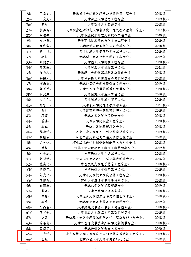 近日,根据市奖学金评审委员会评审,最终确定了2021年天津市大学生创新创业奖学金获奖学生名单。伟德官网2019级无人机系王大泽,2018级智能制造学院金光获创新优秀奖;2019级无人机系蔡伟伟,2019级智能制造学院李国昕获创业优秀奖。
