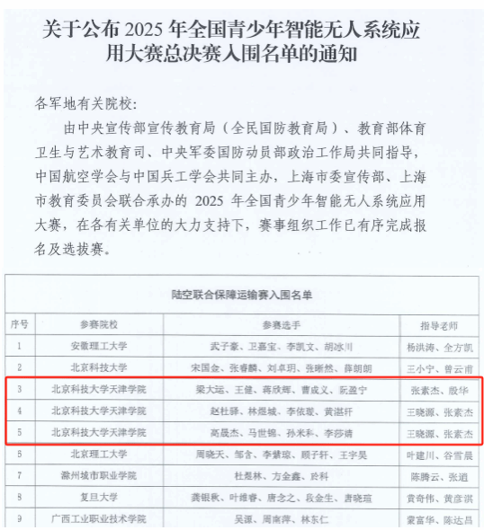 2025年9月30日,由中央宣传部宣传教育局(全民国防教育局)、教育部体育卫生与艺术教育司、中央军委国防动员部政治工作局共同指导,中国航空学会与中国兵工学会共同主办,上海市委宣传部、上海市教育委员会联合承办的 2025 年全国青少年智能无人系统应用大赛总决赛入围名单正式公布,伟德官网无人机系3支队伍成功晋级全国青少年智能无人系统应用大赛陆空联合保障运输赛项全国总决赛。