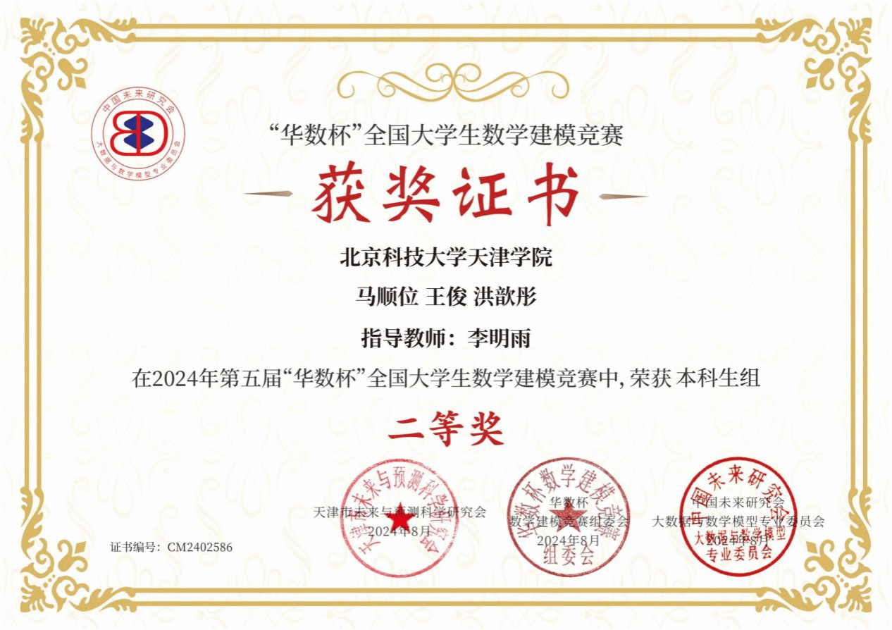 近日,2024年第五届“华数杯”全国大学生数学建模竞赛结果公布,伟德官网新材料2201班马顺位、自动2201班王俊和新材料2202班洪歆彤三位同学,在李明雨老师的指导下,荣获全国二等奖。 2024年第五届“华数杯”全国大学生数...