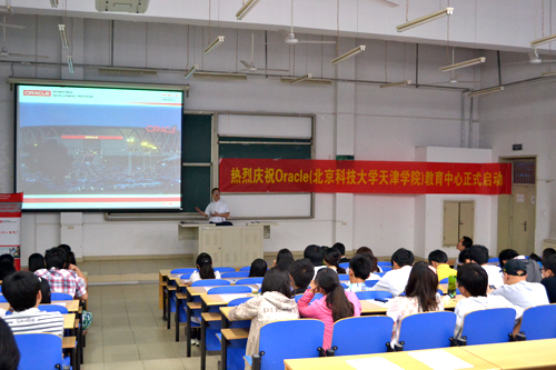 启动仪式上,许主任做了致辞,对中心的正式启动表示祝贺,希望以此为契机,加强校企合作。古东涛做了《Oracle教育中心,校企合作的典范》报告,让同学们进一步了解Oracle公司的企业文化背景、IT行业发展方向及教育中心今后的运作。