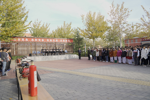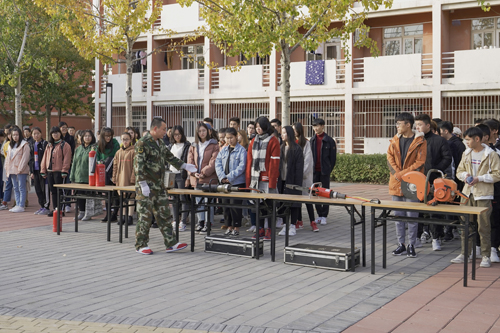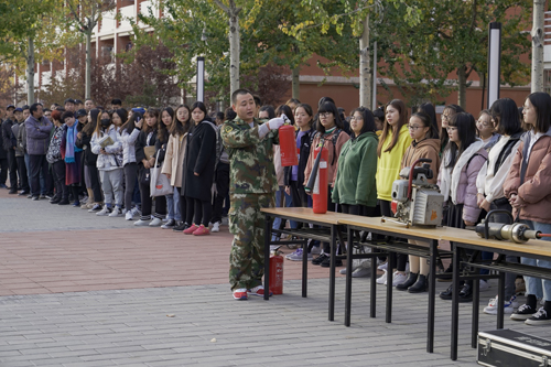 首先进行模拟逃生演练,当警笛声响起,师生在安保人员指挥下按疏散线路从宿舍内迅速撤离,到达指定安全地带集合。疏散撤离过程中师生秩序井然,展现出良好的应急疏散和自救能力。随后保卫处消防科项树磊科长为大家讲解展示了学院配备的各型消防破拆救援工具。