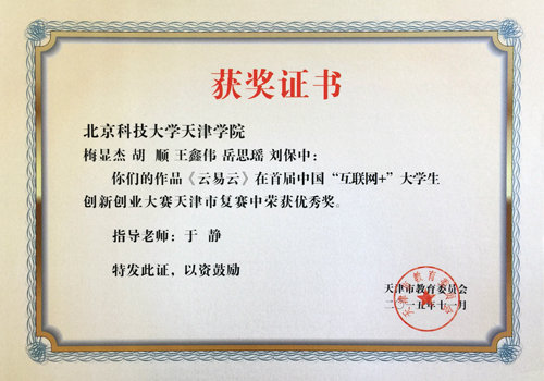 由信息系于静老师指导,梅显杰、胡顺、刘保钟、施祖贤、岳思瑶、王鑫伟6名学生开发的项目《云易云》在首届中国“互联网+”大学生创新创业大赛中表现优异,荣获天津市复赛优秀奖。