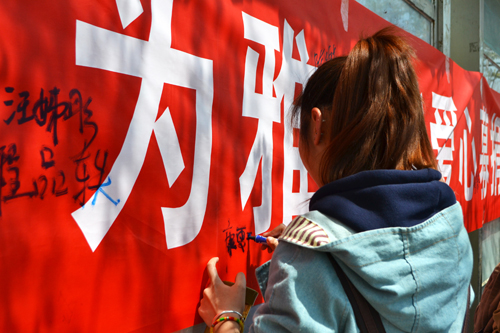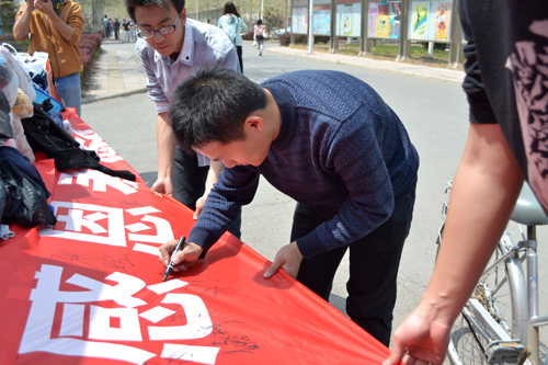 同学们在条幅上签名