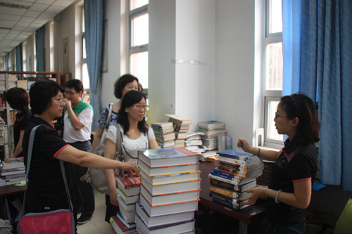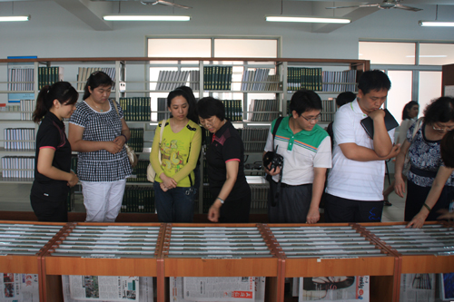 馆长刘淑娥带领各部室主任共四人,对南开大学滨海学院图书馆领导及同仁的到来表示热烈欢迎,并带领他们参观了两馆,详细地介绍了我馆的基本情况、办馆理念、馆舍布局、服务项目等。随后,在理工馆会议室进行了交流,双方针对部门设置、业务流程、资源建设、服务措施、宣传方案、文化建设、支部活动等诸多工作进行了深入探讨,两馆工作人员结合工作实际进行了对口交流。