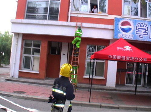 3、火场救援。消防官兵及伟德官网处突小分队成员通过火灾逃生人员的口中了解受困人员具体方位,由伟德官网保卫处处突小分队骨干,利用两节拉梯对火灾现场进行被困人员营救。