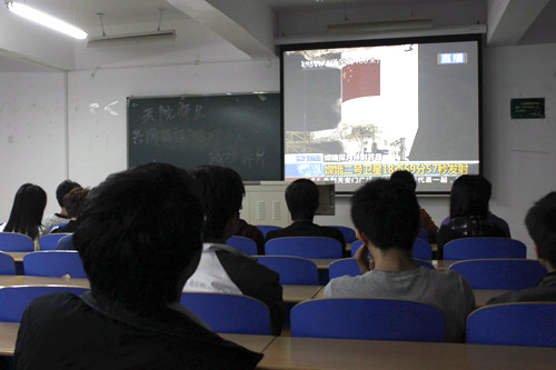 随着“嫦娥二号”腾空而起,在场师生欢呼雀跃。同学们早早就到了教室,等待“嫦娥二号”卫星发射成功的精彩一刻。 近几年来,祖国航天科技事业硕果累累,天院学子始终对此保持热情关注。