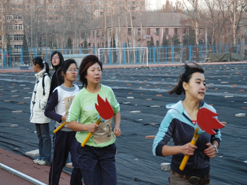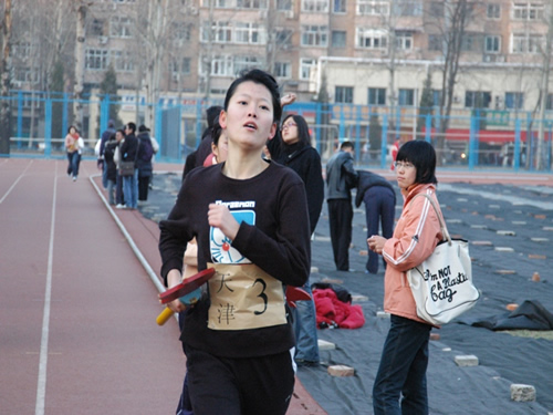 4:30分,比赛正式开始,根据赛制安排,由各学院主管学生工作的老师领跑前50米,之后将接力棒传给各院参赛队员。前四棒为女生,围绕操场跑两圈,完成800米赛程,后六棒为男生,围绕操场三圈,完成1200米赛程。