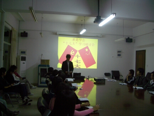 10月18日,伟德官网团委求是学会在行政楼302室召开关于“十七大”政策方针的学习研讨会。求是学会主席团成员及社团部分代表参与了此次研讨会。