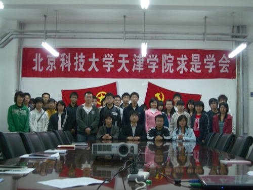 大会首先由副主席彭宇佳主持,全体在场成员起立奏国歌。随后,求是学会副主席彭宇佳先以图片展的形式向同学们回顾我国十六次人大会议的概况,包括国家总书记胡锦涛在“十六大”中关于“六二五”的总要讲话内容。其间,以指明“十七大”路线方针的“四个坚定不移”为重点展开,根据中美GDP增长值、人均资源等资料为实例做出对比讨论,赢得了在场同学的充分肯定。副主席李晋则全部针对“十七大”主题开场,详细学习我国的经济发展状况,社会主义的建设以及我国对内对外的不同政策方针。大会第二部分,求是学会主席娄晏鹏的演讲着重从“十七大”中的“中间社会主义发展”和“思想解放”两个方面出发,以“思想”为关键词通过讨论当代大学生的思想建设,指出先进的思想代表着就是当代大学生,切实将“十七大”的方针、路线引入大学生活,真实透彻的讲解了“十七大”的精神目标要求,他还以“十七大”中“创造历史,开创未来”为根本,提出求是学会在本年度的发展方向是创新。研讨会最后邀请同学们观看了我党“十七大”开幕式实况录像。最后,参加研讨会的全体同学合影留念,研讨会至此圆满落幕。