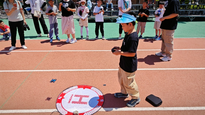随后开展了室外无人机障碍穿越飞行。孩子们在老师的指导下学习无人机操控方法,兴奋地操控遥控器,看着小小无人机穿越障碍圈,活动现场欢声笑语不断。