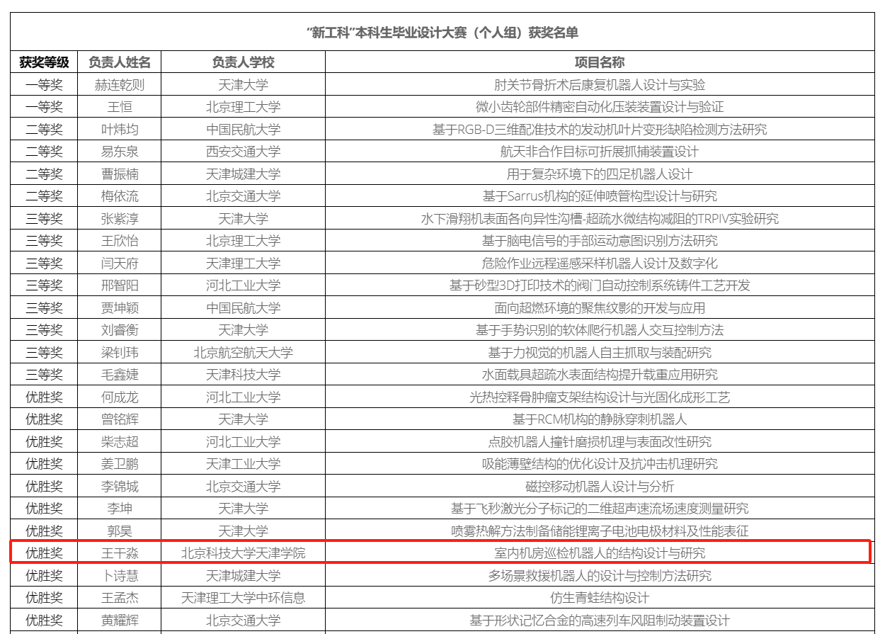 近日,由天津市教委主办的第四届“新工科”本科生毕业设计大赛(暨第十八届“广数杯”本科生毕业设计大赛)全国总决赛圆满落幕。伟德官网智能制造学院机械工程专业2024届毕业生王干淼的毕业设计《室内机房巡检机器人的结构设计与研究》(指导教师:班岚副教授)荣获优胜奖,这是伟德官网学生在此项赛事中首次获奖。