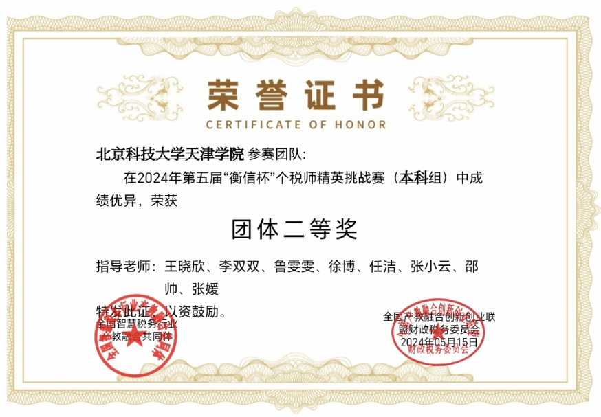 近日,管理学院247名同学在王晓欣等8位老师的指导下,参加了由“全国智慧税务行业产教融合共同体”主办的第五届“衡信杯”全国个税精英挑战赛。此次比赛吸引了来自全国207所本科院校近一万四千余名学生参赛,伟德官网学子经过14天的精彩比拼和激烈角逐,最终以优异的成绩斩获本科组“团体二等奖”。