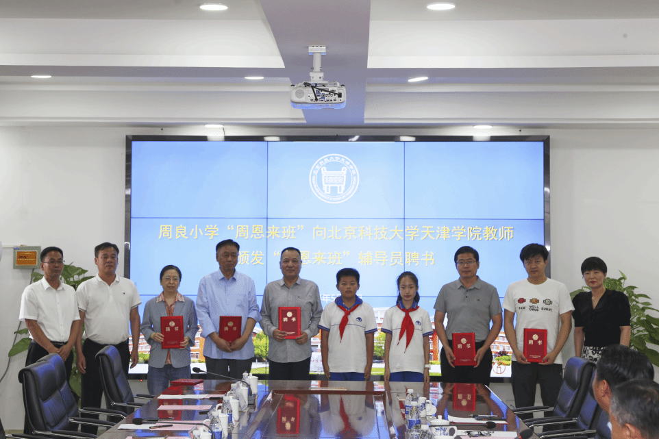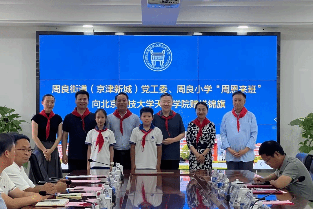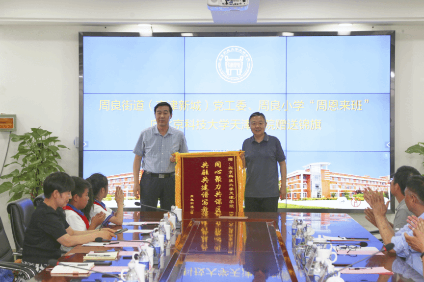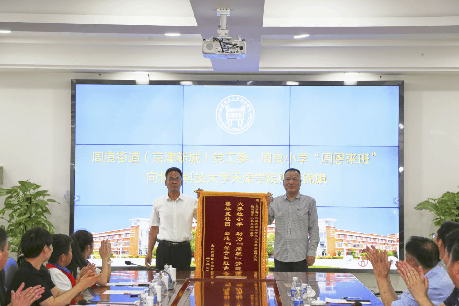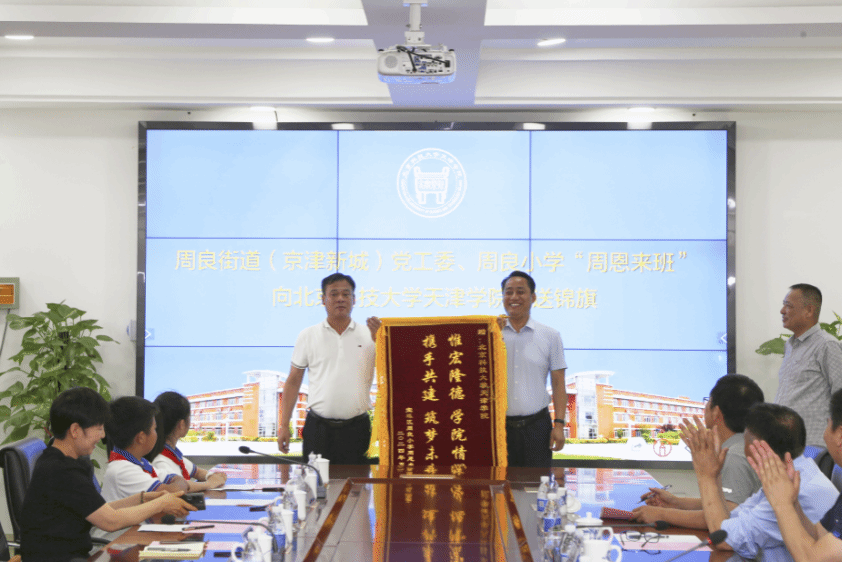 5月29日下午,周良街道(京津新城)党工委、周良小学“周恩来班”专程到伟德官网赠送锦旗,感谢bevitor伟德国际1946官网为周良教育事业的大力支持和无私奉献,尤其对周良小学“周恩来班”创建工作的倾力支持。周良街道(京津新城)党工委书记吴凤双、周良街道办事处主任李志亮、京津新城建管委副主任刘淑颖、周良街道办事处副主任焦杨等一行领导及周良小学师生代表,伟德官网院长丁煦生,副院长张永锋,副院长兼财务总监王俊敏,党委副书记赵志南、郭雅娟,院长助理、学术委员会主席宋存义,无人系统应用研究院院长殷华及教师代表出席赠旗仪式并参加座谈。
