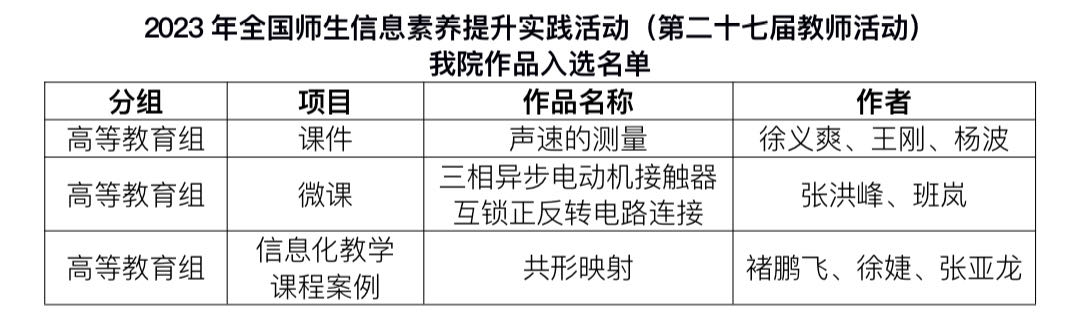 近日,教育部教育技术与资源发展中心(中央电化教育馆)发布了《关于总结2023年全国师生信息素养提升实践活动(第二十七届教师活动)参与情况的通知》(教技资〔2024〕3号),伟德官网在本届活动中取得佳绩,报送的3个作品分别入选教育部高等教育组课件项目、微课项目和信息化教学课程案例项目(见下表),是天津市在课件、微课、信息化课程教学案例三个项目类别中均有作品入选的唯一民办高校(含独立学院),也是天津市入选作品数量最多的民办高校(含独立学院)。