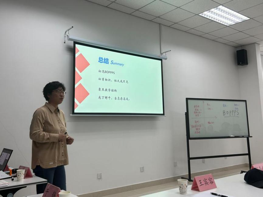 之后,米岩老师为大家做了BOPPPS教学法的含义和运用方式的具体讲解,从导入、目标、前测、参与式学习、后测和总结六个方面分别介绍了每个环节可以采取的方法和策略,为各位基层教师带来了非常大的启发和收获。