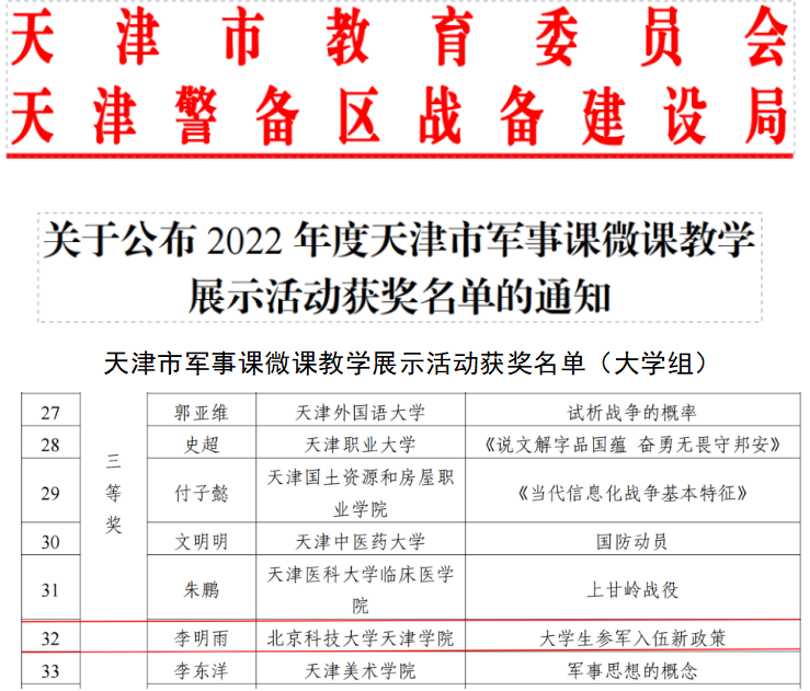 近日,由天津市教育委员会、天津警备区战备建设局主办的2022年度天津市军事课微课教学展示活动成绩揭晓,伟德官网教师李明雨的军事理论课微课展示作品《大学生参军入伍新政策》荣获大学组三等奖。