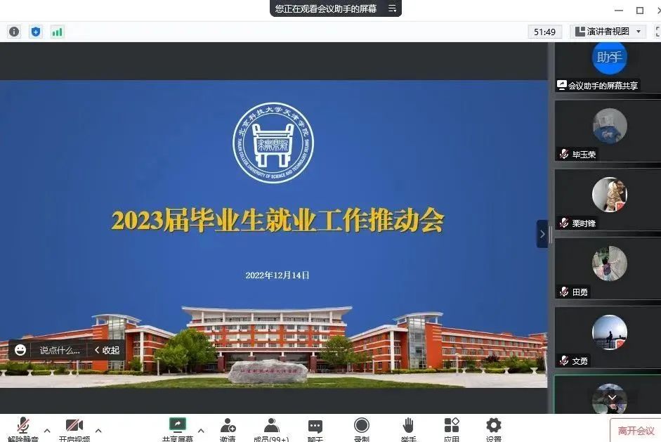 会上,招生就业处处长田勇介绍2022届毕业生就业工作情况和2023届毕业生就业重点工作。部分院系就2022届毕业生就业工作的典型做法进行了经验交流。智能制造学院党总支书记、副院长陈月介绍了智能制造学院构建领导重视、齐抓共管的就业工作队伍,在拓宽就业途径、提升职业技能、实施精准帮扶等方面的工作经验;外国语学院副院长张绚围绕将毕业论文指导教师作为学生就业的第一责任人,充分发挥专业课教师的自身优势,实施全过程全方位的就业指导等方面进行了交流;城市建设学院教师杨建功分享了城市建设学院将毕业设计与就业实习相结合,搭建专业实习基地,开展订单式人才培养的工作方法;经济学院2022届毕业班辅导员文勇分享了作为毕业班辅导员做好就业工作的经验和招法。